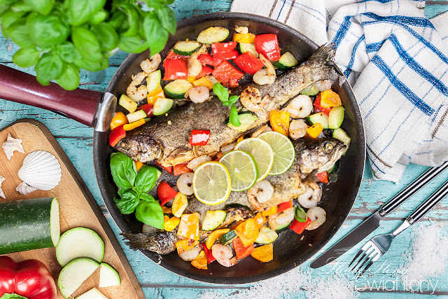 RYBA Z PATELNI Z KREWETKAMI I CHRUPIĄCYMI WARZYWAMI