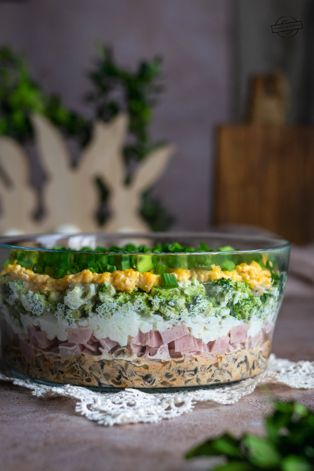 Ciekawa sałatka warstwowa, składająca się z warstwy podsmażonych pieczarek, szynki, brokułu i…