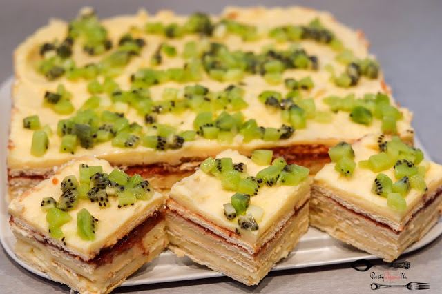 Warstwowe ciasto na klasycznym biszkopcie nasączone ponczem cytrynowym, masa z winnych jabłek i galaretki, przełamana maślanym kremem kajmakowo-kawowym z orzechami włoskimi duet doskonały i bardzo smaczny.Na stałe zagości w moim repertuarze warstwowych ciast.Polecam!