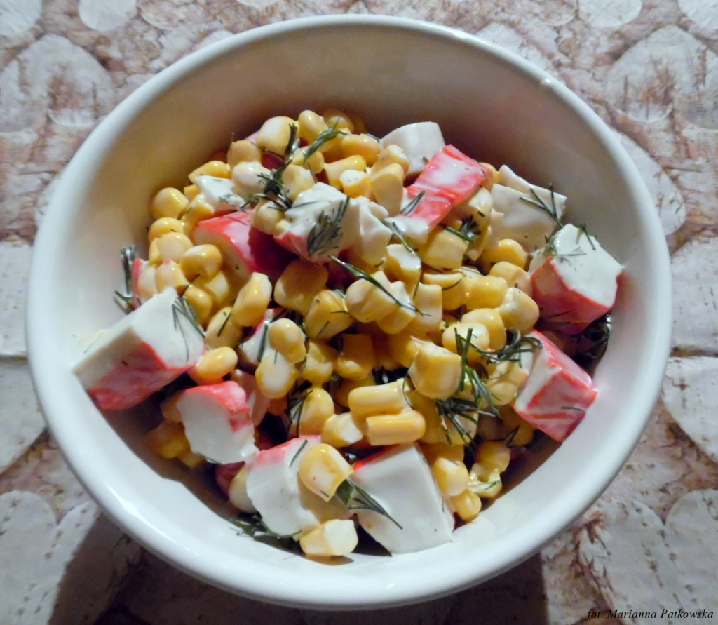 Jedną z chyba najprostszych i powszechnie lubianych sałatek jest sałatka krabowa. Trochę, powiedziałabym, oszukańcza krabowa, bo nie znajdziemy w niej prawdziwego kraba, a jedynie mięso surimi, jednak mimo swojej prostoty i małego oszustwa znakomicie nada się nawet na najbardziej eleganckie przyjęcie stojące, poza tym można ją w nieskończoność