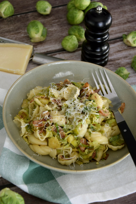 Makaron z brukselką i boczkiem