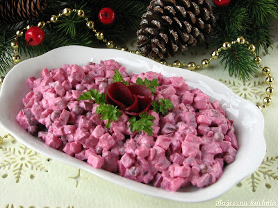 Bardzo smaczna sałatka śledziowa z burakami, ładnie wygląda, przyrządziłam ją na kolację wigilijną, wszystkim gościom bardzo smakowała. Do sałatki użyłam majonezu dekoracyjnego od firmy