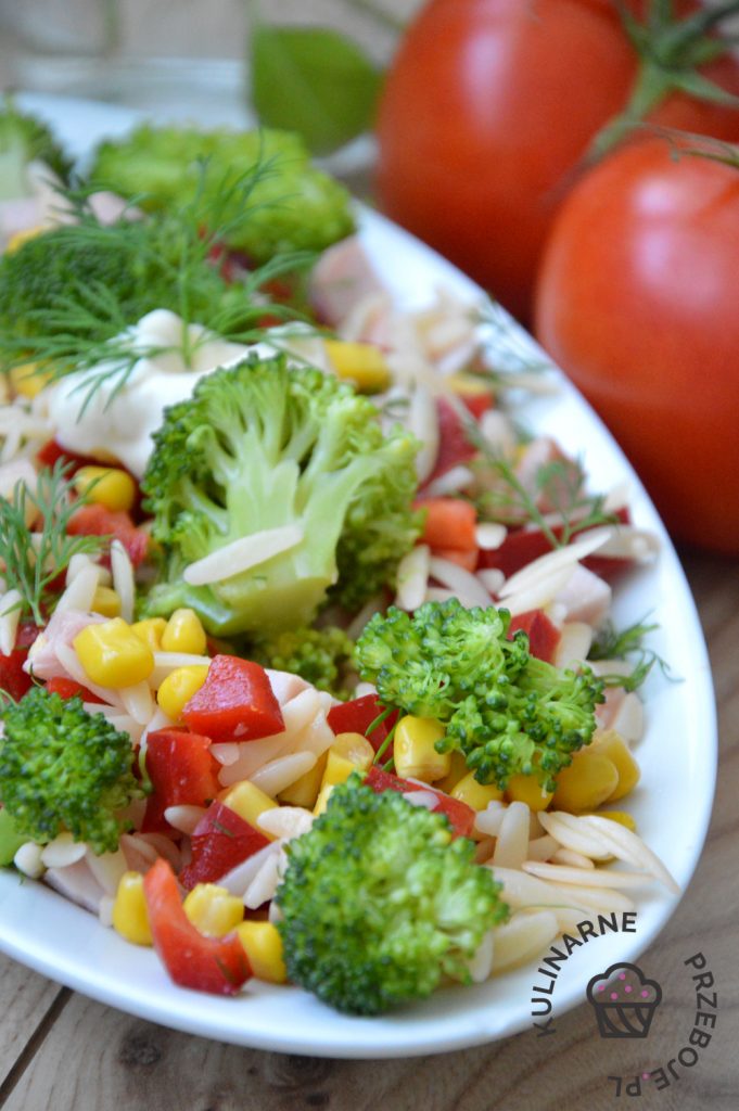 Sałatka z brokułem, szynką i makaronem w kształcie ryżu -kolorowa i pyszna…