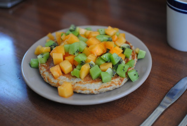 Nie pamiętam dokładnego składu, ale było tam: mąka pełnoziarnista, nasiona chia, jajko, trochę białka miodowo-waniliowego, cynamon, płatki owsiane. A podałam z kaki
