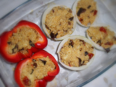 1 duża cebula1 czerwona paprykaFarsz:1 szkl. kaszy jaglanej5-6 grzybów mungarść (około 10g) rodzynek1 cebulka, 1 ząbek czosnku1/3 suszonej papryki chilli5 suszonych