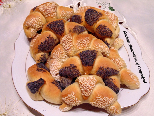 Drożdże rozpuszczamy w mleku dodajemy mleko w proszku i cukier. Dodajemy roztrzepane jajko, mąkę i sól. Wszystko zagniatamy i po trochu dodajemy masło. Cały czas zgniatamy do momentu uzyskania jednolitej sprężystej masy. Przykrywamy i zostawiamy do wyrośnięcia na około godzinę. Po tym czasie ciasto dzielimy na dwie części, każdą rozwałkowujemy na placek około 0,5 cm dzielimy na 8 części. Zwijamy od szerszej części. Jedną stronę moczymy w mleku a potem w maku/sezamie układamy na blasze wysypanej mąką ziemniaczaną albo na papierze do pieczenia. Zostawiamy na kolejną godzinę. Pieczemy w nagrzanym piekarniku / 200 stopni / przez 20 minut. Smacznego