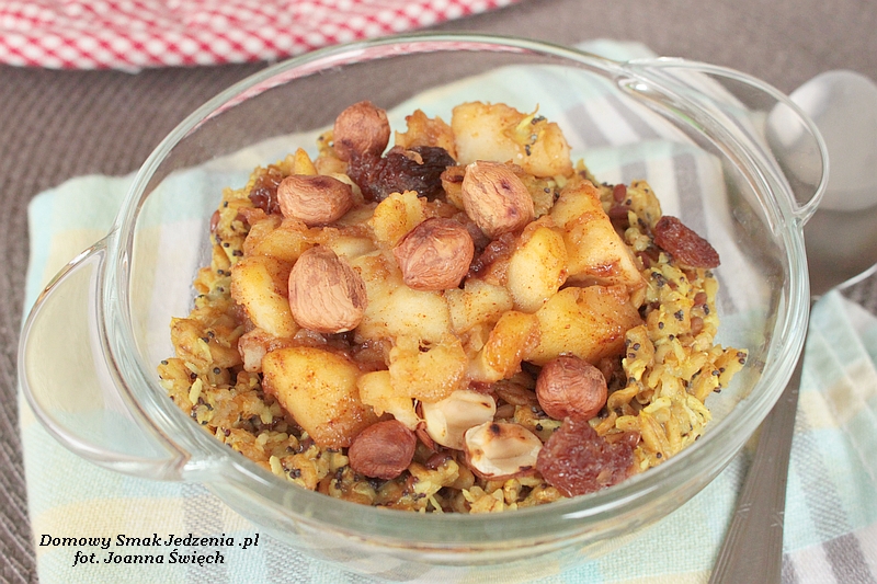 Do rondelka wsypujemy płatki owsiane, siemię lniane, mak, wiórka kokosowe, rodzynki