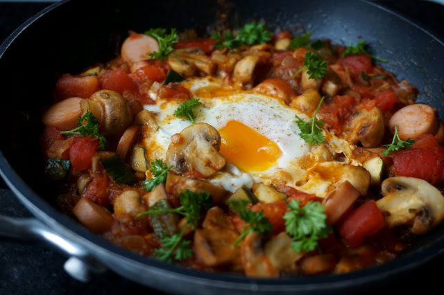 Składniki:średnia cebulaząbek czosnku8-10 małych pieczarekmała cukinia2 dowolne kiełbaski (u mnie parówki)3-4 średnie pomidory (opcjnalnie puszka pelatti)sól, czarny pieprz, oregano, tymianek2-3 jajkałyżka masłałyżka oliwy