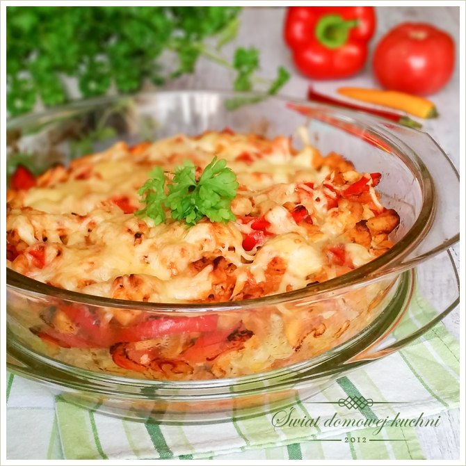 200 g makaronu świderki,1 esencja do duszonego kurczaka Knorr,2 szt. fileta z kurczaka,1,5 szt. cebuli,1 czerwona papryka,1 pomidor,2 łyżki przecieru pomidorowego,1 ząbek czosnku,20 dag tartego sera żółtego,olej do smażenia.