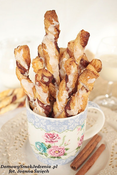 Ciasto rozwijamy. Masło roztapiamy i smarujemy nim całą powierzchnię ciasta. Cynamon mieszamy z cukrem i posypujemy mieszanką wierzch