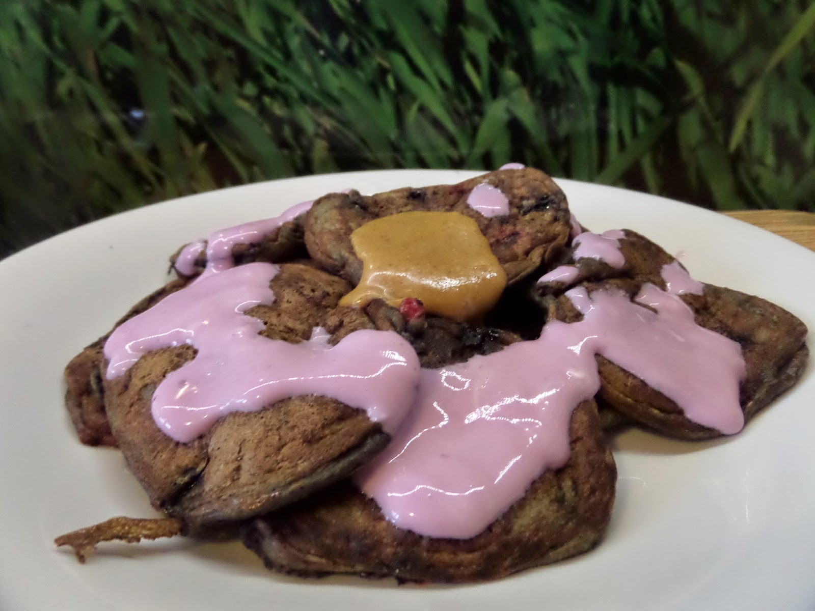 karobowe placuszki z owocami leśnymi podane z masłem orzechowym i sosem jogurtowo…