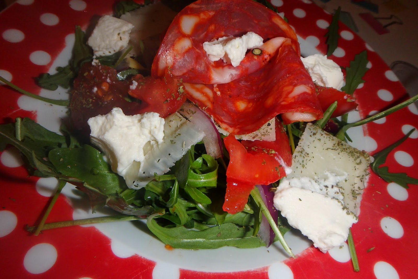 Sałatka z rukolą, szynka dojrzewającą i serowym trio