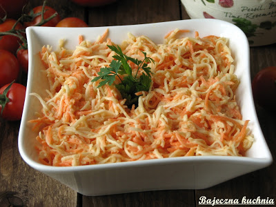 Smaczna i zdrowa surówka z selera, marchewki i jabłka z dodatkiem śmietany, stanowi doskonały dodatek do obiadu.