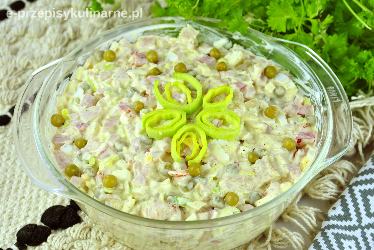 Sałatka z wędzonym kurczakiem i pieczarkami marynowanymi, a także groszkiem, porem oraz…