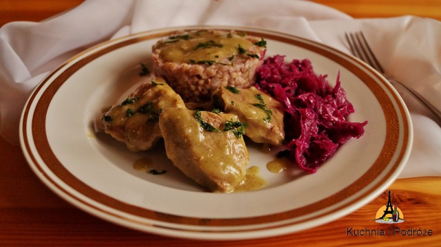 Wieprzowina w sosie pesto, do tego biała kasza gryczana i czerwona kapusta