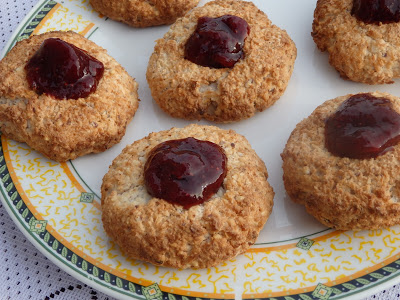 Mocno kokosowe ciasteczka z dodatkiem migdałów a do tego nadziane ulubionym dżemem. Pomył zaczerpnęłam z jakiegoś programu kulinarnego a że akurat po wypiekach z Tłustego Czwartku zostały mi białka to trzeba było je wykorzystać.