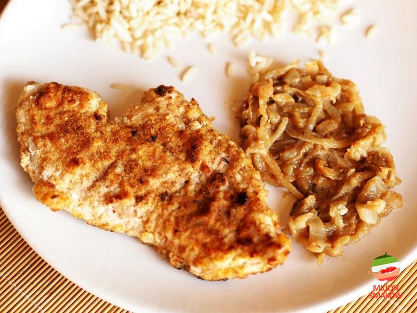 Jeśli pierś usmażymy na minimalnej ilości tłuszczu to panierka będzie chrupiąca i dobrze będzie się komponować z duszoną cebulą.