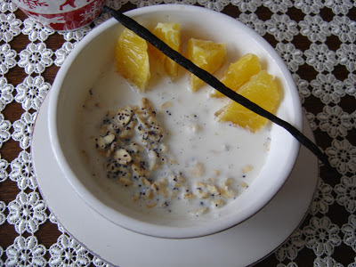 – 5 łyżek płatków owsianych (ok. 50 g),- szklanka mleka (ok. 250 ml),- łyżka maku (ok. 10g),- pomarańcza (ok. 300g).