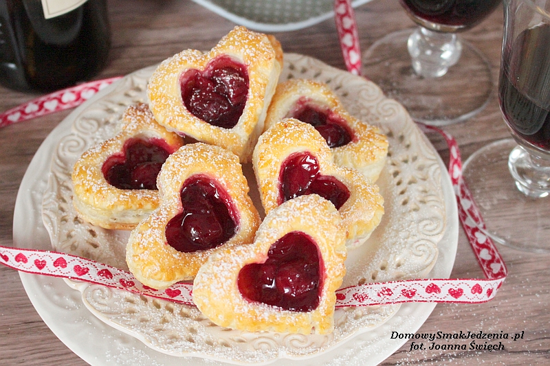 Ciasto francuskie rozwijamy. Wykrawamy (w moim przypadku) 10 dużych serduszek, w 5 z nich, na środku wykrawamy mniejsze serduszka. Pełne serduszka przekładamy na blaszkę wyłożoną papierem do pieczenia i smarujemy