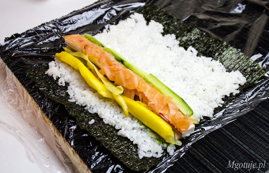 Na wczorajszą kolację przygotowałam domowe sushi, które zrobiłam z wędzonym łososiem, paluszkami krabowymi, ogórkiem i mango. Jako dodatków użyłam kremowego serka typu philadelphia, pasty wasabi oraz marynowanego imbiru. Przyznam Wam, że pierwszy robiłam domowe sushi. Zawsze omijałam je ze względu na to, że nie przepadam za surową