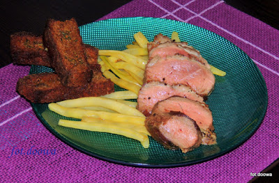 Grillowane piersi gęsie z chrupiącymi grzankami i fasolką szparagową