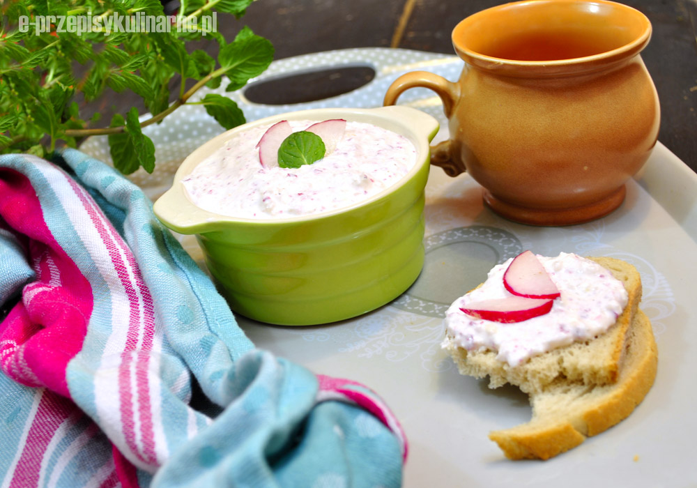 Jeśli posiadamy blender, to po prostu miksujemy, najpierw rzodkiewki i cebulę, potem dodajemy resztę składników. Jeśli blendera nie posiadamy, to cebulę kroimy w drobną kostkę, rzodkiewki ścieramy na drobnej tarce, twaróg