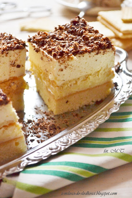 Nie mam dziś dla Was typowo walentynkowego przepisu pełnego serduszek, ale mam za to naprawdę pyyyyszne ciasto:) Puszysty biszkopt, masa budyniowa i delikatna warstwa śmietanki. Wszystko z małą nutką cytryny. Krótko mówiąc ciasto słodko – kwaśne, jak to w życiu bywa;)
