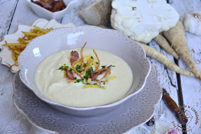 Krem z białych warzyw z chipsami boczkowymi i ziemniaczanymi chruścikami
