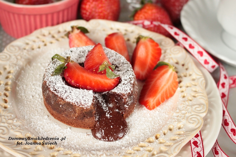 Masło roztapiamy z czekoladą w kąpieli wodnej. W osobnym naczyniu miksujemy na puszystą masę jajko, żółtko oraz cukier. Do masy jajecznej dodajemy mąkę, miksujemy. Następnie dodajemy ciepłą