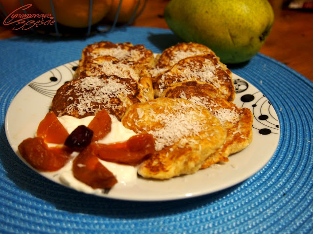 Zostało mi w puszce trochę mleka kokosowego i tak sobie pomyślałam, że może by tak jakieś placuszki wykombinował. Jak pomyślałam tak też zrobiłam. I z tego kombinowania wyszło wspaniałe pożywne i zdrowe śniadanie w stylu fit. Placuszki wyszły puszyste, intensywnie kokosowe z lekko kwaskowatym akcentem w postaci jabłka. Mój Mężczyzna
