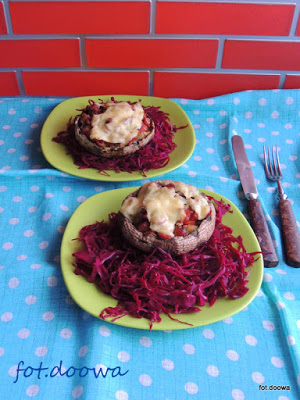 Portobello zapiekane z frankfurterkami i kiszoną czerwoną kapustę.