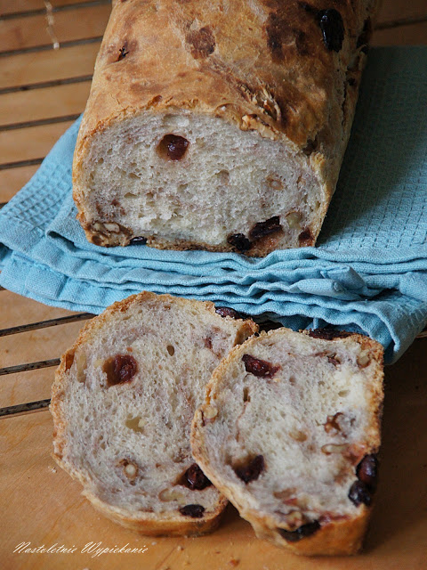 Prosty chleb z mąki pszennej z dodatkiem suszonej żurawiny i uprażonych orzechów włoskich. Przepis pochodzi z rewelacyjnej książki Pawła Małeckiego „Cukiernia Lidla”. Jest mięciutki, puszysty, a ponadto nie sprawia problemów podczas przygotowania. Zapach jaki roznosi się po domu podczas pieczenia jest cudowny. Żurawina nadaje chlebku słodyczy i sprawia, że jest
