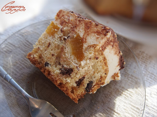 To ciasto jest wywołuje na mych ustach uśmiech na samo wspomnienie o nim. Nie wiem czy to zasługa złocistych moreli, których kolor przypomina mi słońce (a ostatnio zdecydowanie go brakuje), czy może delikatnego, puszystego ciasta z kawałkami czekolady, czy wreszcie lekkiej serowej pianki oblanej czekoladą. Jedno jest pewne to fantastyczna