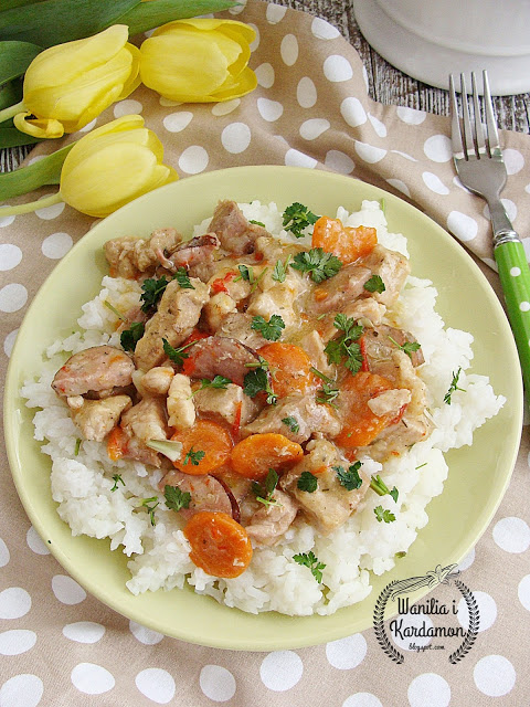 Jest to prosta ale i bardzo smaczna potrawa z wieprzową szynką i kiełbasą, wyśmienicie smakuje z gotowanym na sypko ryżem lub kaszą, potrawą ze względu na dostępność składników można delektować się cały rok. Polecam!