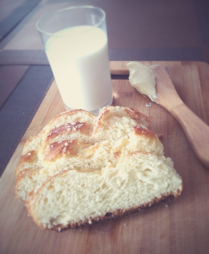 Pamiętam z czasów podstawówki – mój tata często kupował chałkę, delikatną ze słodką kruszonką na wierzchu. Na drugie śniadanie, więc często jadaliśmy z masłem i popijaliśmy szklanką mleka. Postanowiłam przypomnieć sobie ten smak choć pewnie i tak to nie to samo, co kiedyś, ale przynajmniej przywołało miłe wspomnienia.