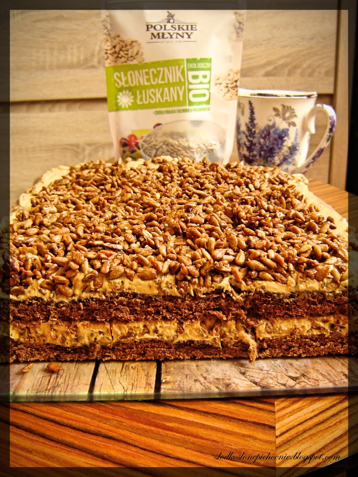 Dwa blaty kakaowego ciasta biszkoptowego przełożonego kremem na bazie masła, kajmaku i…