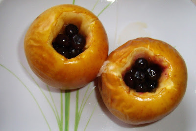 Najprostszy w świecie deser, który często robiła moja mama. Chociaż, ona niczym ich nie faszerowała tylko piekła całe, ale u mnie dla odmiany z borówkami.