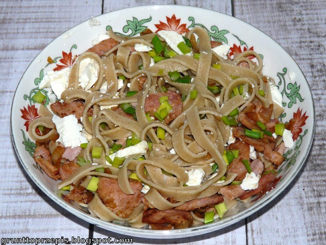 Dziś prezentuję obiad w wykonaniu Pana Męża, który przy jego przyrządzaniu trzymał się jednej, bardzo prostej zasady: co się nawinie w lodówce, to do makaronu!
