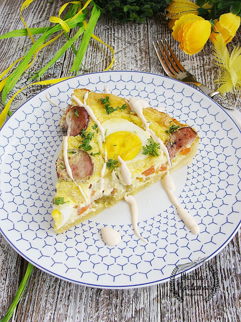 Kruche ciasto na słono i nadzienie z jajek, kiełbasy swojskiej drobiowej, cebuli i mieszanki warzywnej meksykańskiej to propozycja na obiad czy ciepłą kolację, jest pyszna a dodatek zupy cebulowej podkreśla jej smak.