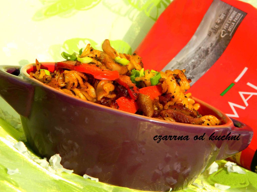 Składniki 200 g makaronu Malma 100 g boczku 100 g boczniaków 1/2 papryki czerwonej 2-3 dymki słodka papryka pieprz kajeński zioła prowanslaskie sól, pieprz Sposób przygotowania Makaron ugotować al dente. …