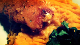 Dzisiejszy dzień sponsoruje kolor pomarańczowy. Pomarańczowe jest dyniowo-ziemniaczane puree, oraz panierka do rybnego kotleta. Puree jest bardzo zdrowe, kotlecik zaś, hmm, miałam wielką ochotę na rybę w panierce. Wolałam zrobić ją sama, niż kupić gotowca z zamrażarki. Mój kotlecik jest smażony przez 2 minuty, następnie pieczony, więc myślę,że całkiem przyzwoitym
