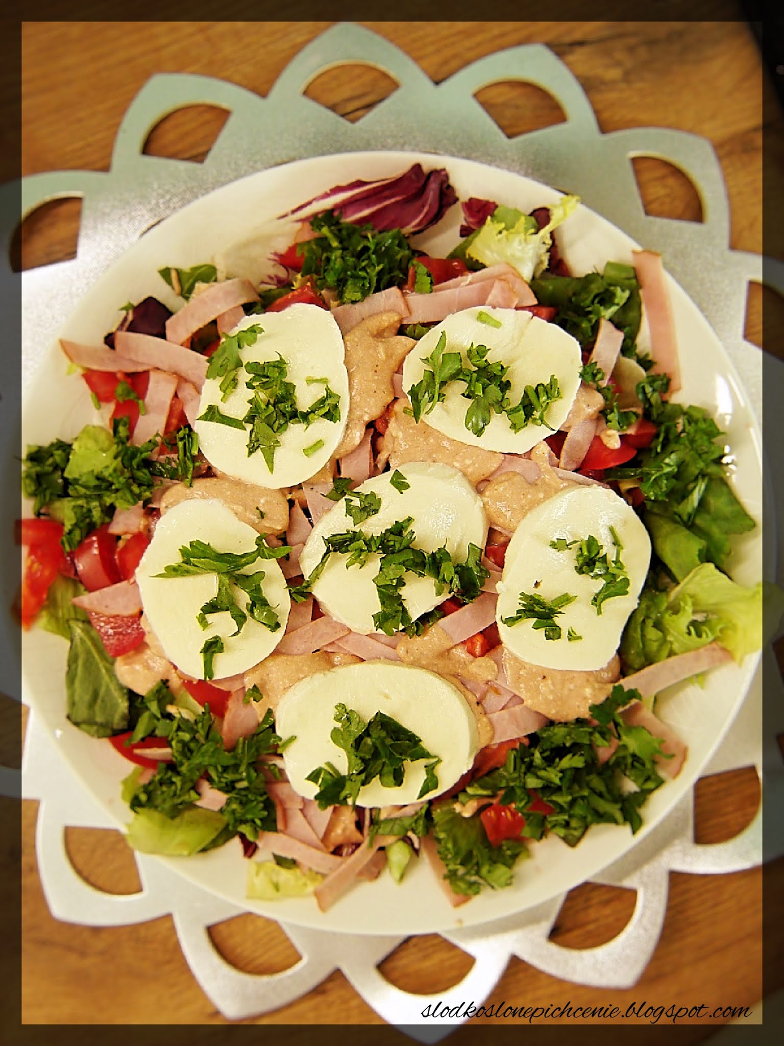 Pomidory oparzyć, obrać ze skórki, pokroić w ósemki, ułożyć