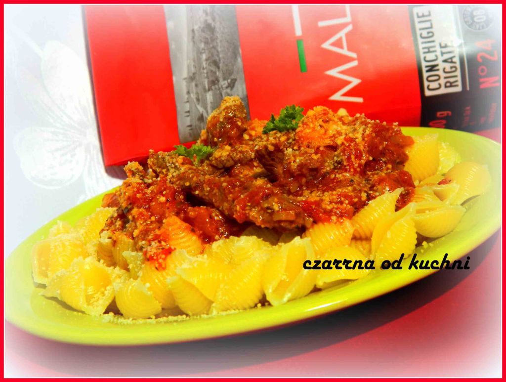 Na ostro 😉 Składniki 200g mięsa wołowego – u mnie łopatka 200g makaronu muszelki Malma 1 puszka krojonych pomidorów 1 cebula 100g boczniaków 1 szklanka białego wytrawnego wina 1 papryczka chili …