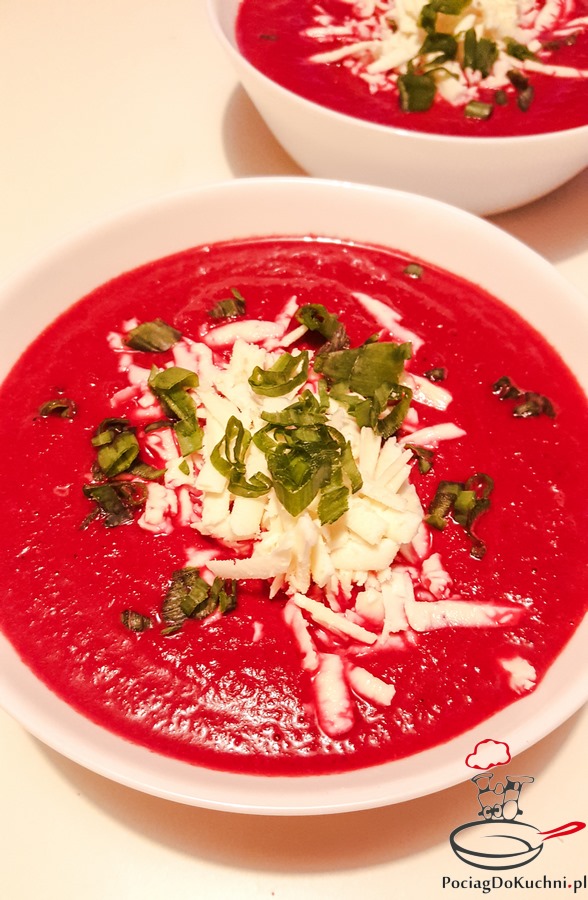 Zupa krem z pieczonych buraków jest naprawdę niezwykła. Bardzo lekka, kremowa, w smaku nie przypomina barszczu, za to wręcz oszałamia kolorem. Delikatnie słodka od jabłek, lekko kwaskowa od balsamico, aromatyczna od bulionu i pieczonych buraków. Choć lekka, to sycąca. I ten kolor… Zupa krem z pieczonych buraków jest po prostu