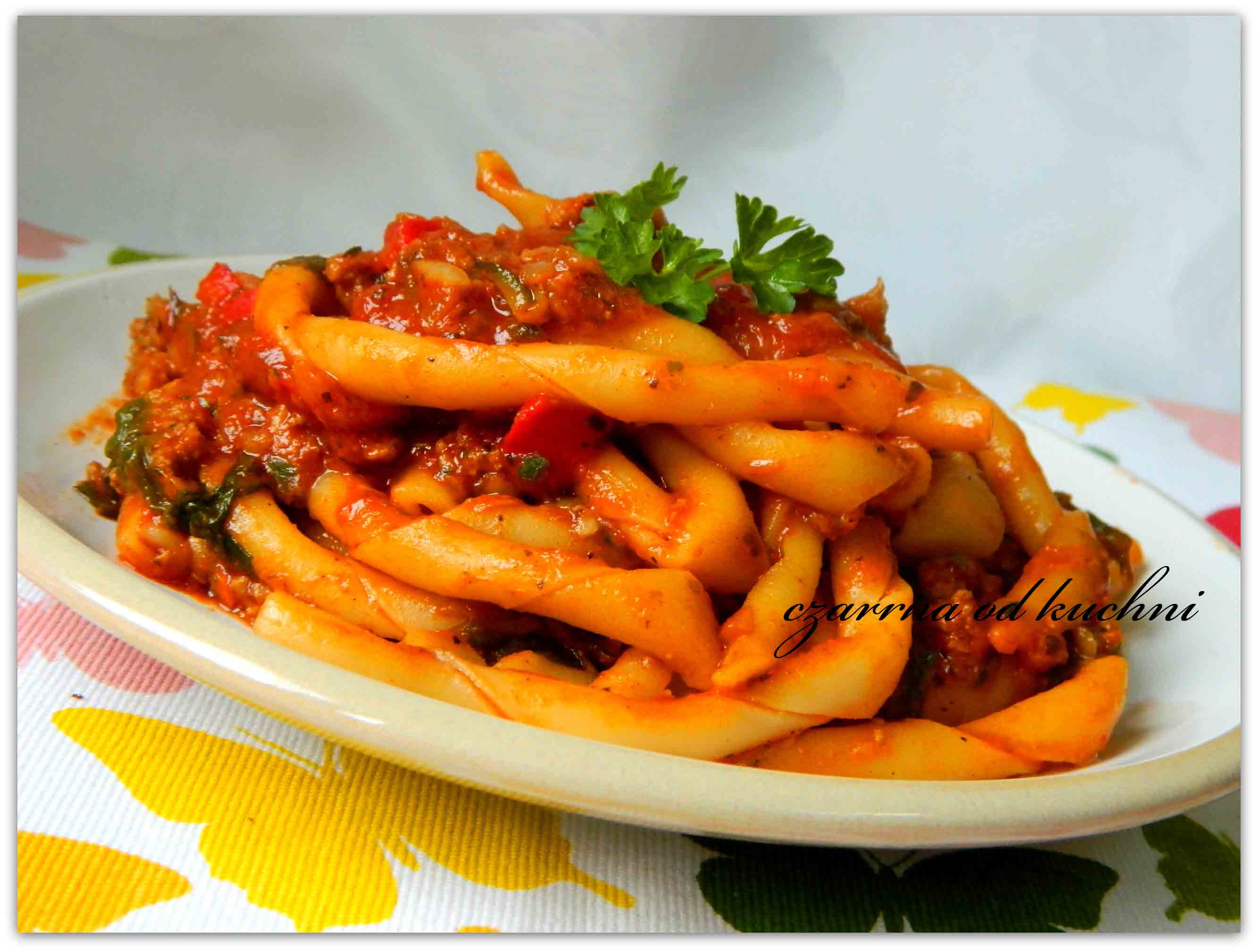 Aromatyczne danie kuchni włoskiej Składniki 300 g makaronu Fusilli al torchio (lub innego :)) 250 g zmielonej łopatki wieprzowej 100 g świeżego szpinaku 1/2 czerwonej papryki 1/2 niedużej cukinii 2 …
