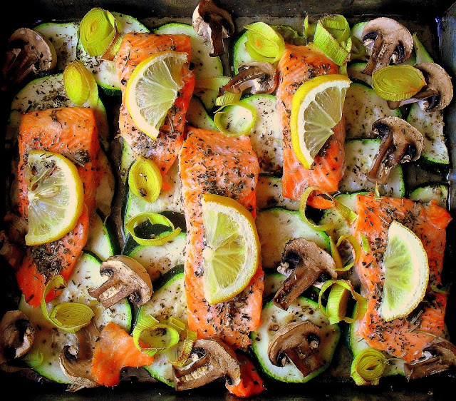 Na zdrowy, lekki i szybki obiad proponuję dziś łososia pieczonego na delikatnych plastrach cukinii. Ja upiekłam całość z moimi ulubionymi włoskimi ziołami i plastrami cytryny, które podczas pieczenia wypuściły sporo soku, doprawiając rybę. Danie będzie idealne z brązowym ryżem, prostą sałatką i jogurtowym sosem. Smacznego:)