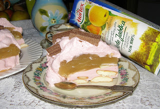 smaczny deser z sokiem jabłkowym i jogurtem z biszkoptami i bitą śmietaną galaretkową…