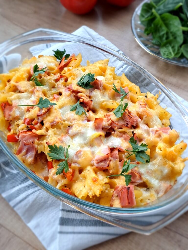 Smaczna, aromatyczna i kolorowa zapiekanka makaronowa z szynką i papryką w kremowym…