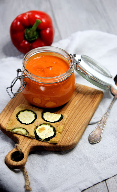 Sos z pieczonej papryki z pomidorami, znakomity na ciepło i zimno, pasuje do makaronu, pizzy, zapiekanek, kanapek i innych potraw. W sezonie przygotuj go ze świeżych pomidorów pozbawionych gniazd nasiennych i skóry, zimą i wiosną zdecydowanie lepsze będą pomidory z puszki.