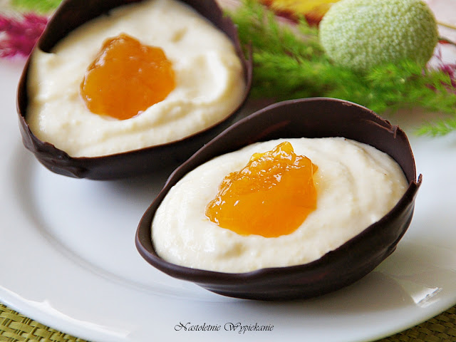 Pomysł na te jajeczka podpatrzyłam w internecie. Są urocze! Czekoladowe skorupki uzyskuje się przy pomocy wypełnionych powietrzem balonów, które później przebija się igłą i delikatnie odrywa od czekolady. Bardzo pomysłowy patent na wielkanocne jaja 😉 Moje wypełnione były kremem z serka mascarpone i białej czekolady, a jako żółtko posłużyła mi